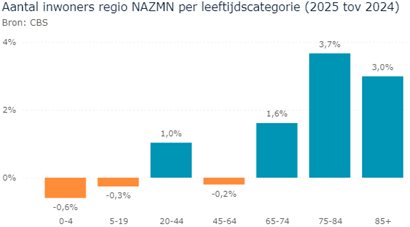 Groei aantal inwoners regio NAZMN per leeftijdscategorie (2025 t.o.v. 2024). Bron: CBS